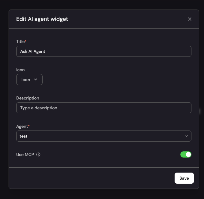 When adding an AI agent widget to your dashboard, you can configure whether to use the MCP server backend mode. During widget configuration, you'll see a "Use MCP" toggle option: