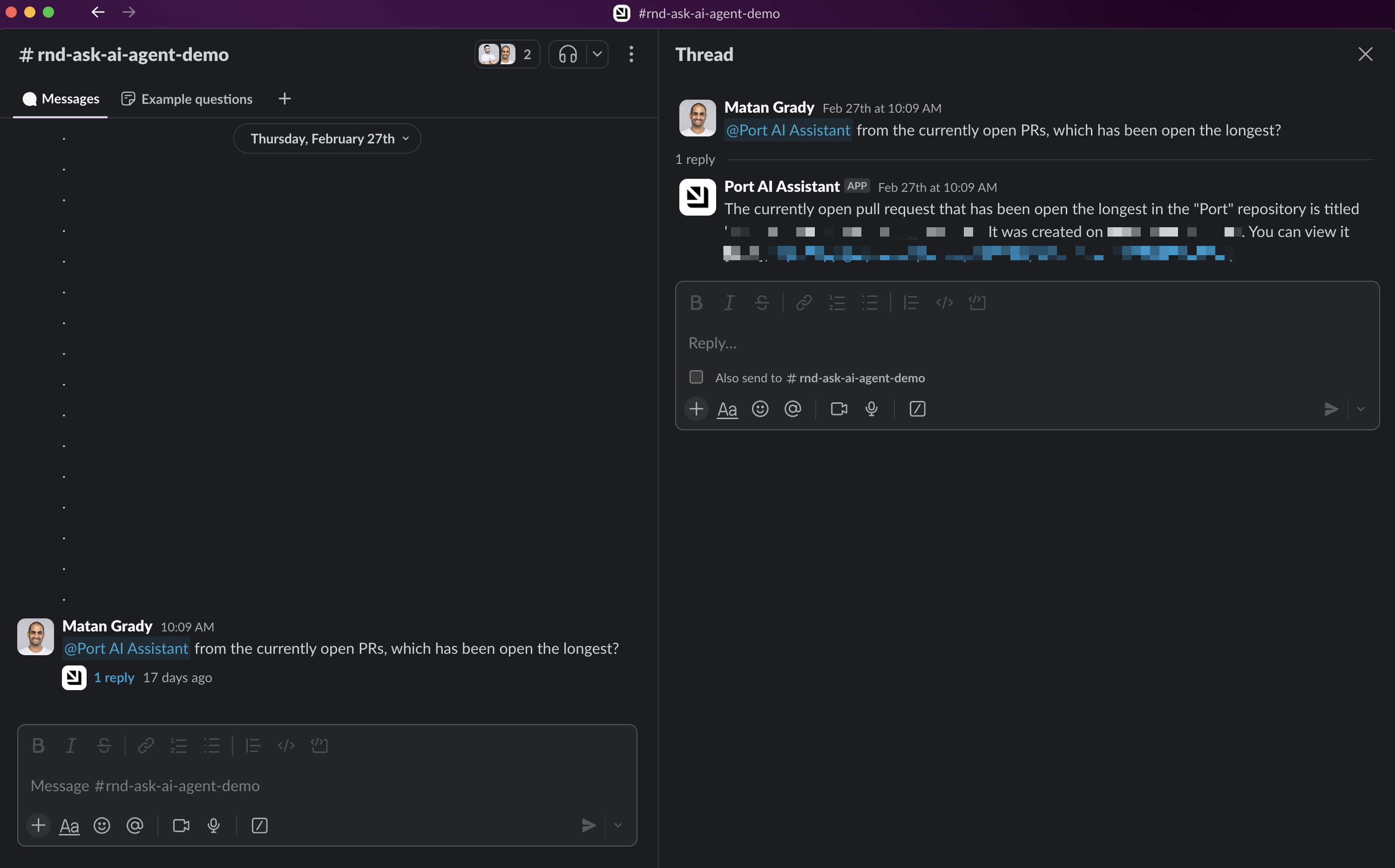 The Slack integration provides the most natural way to interact with Port's AI agents. This method abstracts all technical details, allowing for free-flowing conversations. By default, messages sent to the Port Slack app (either via direct message or by mentioning it in a channel) are handled by the agent router.