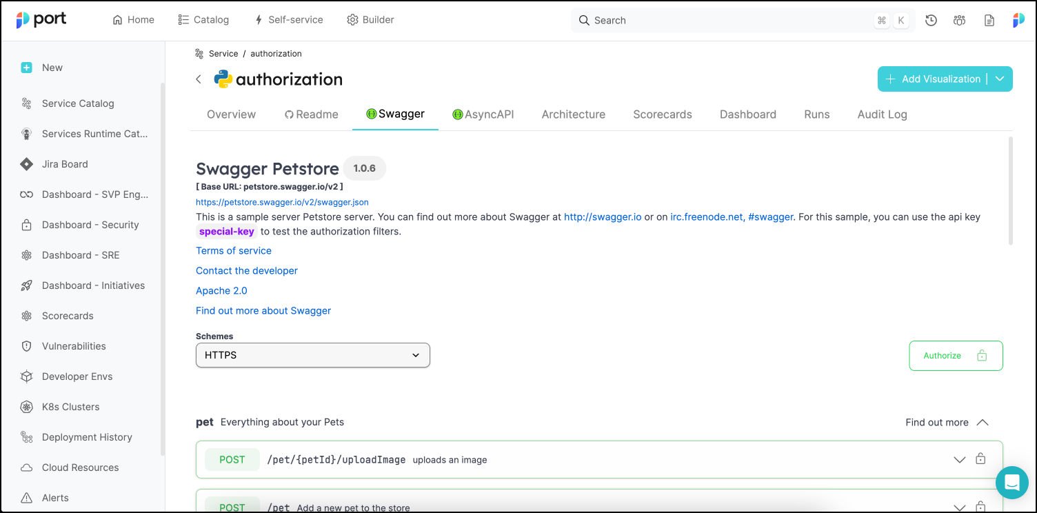 Using this property will automatically create an additional tab in each entity page, displaying the specification files in Swagger UI format. Within this tab, you will be able to perform HTTP calls to the spec target directly from Port.