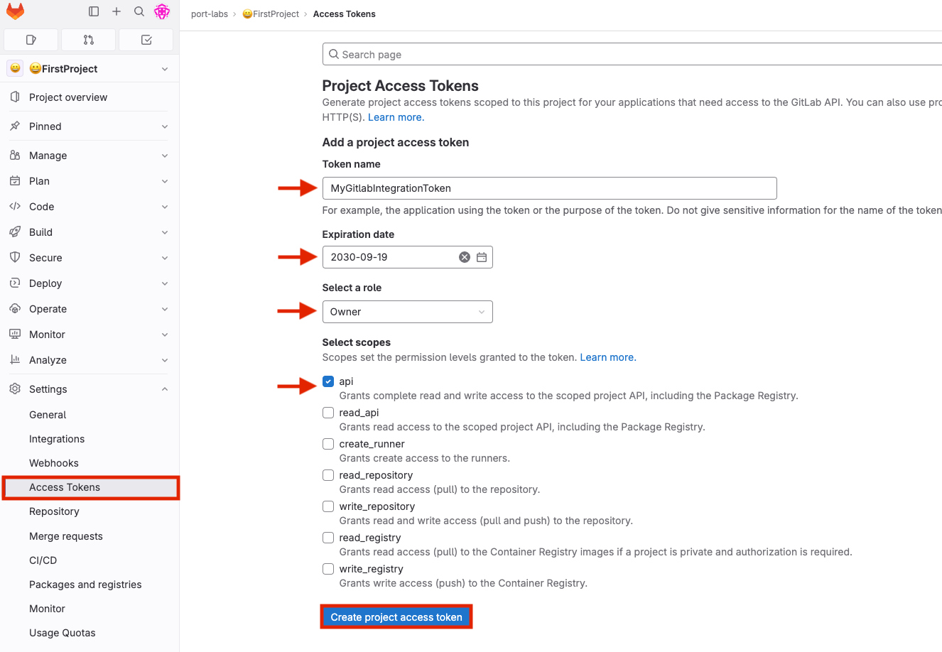 In the "Access Tokens" section, you need to provide the token details, including the name and an optional expiration date. Additionally, select the api scope, and then proceed to click on the "Create access token" button.