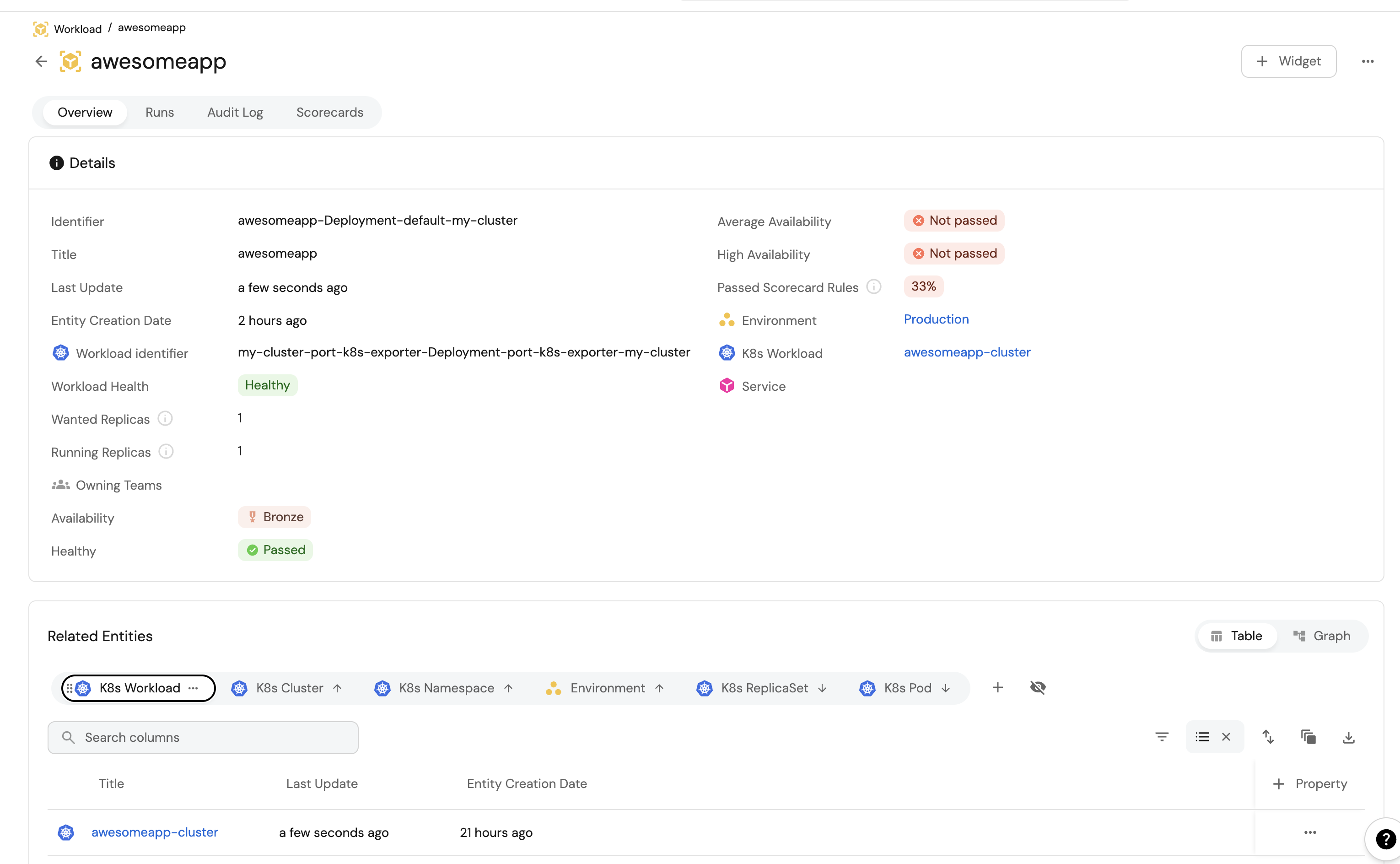 Deploymentresource in your cluster with a label matching the identifier of aWorkloadin your Software catalog.
